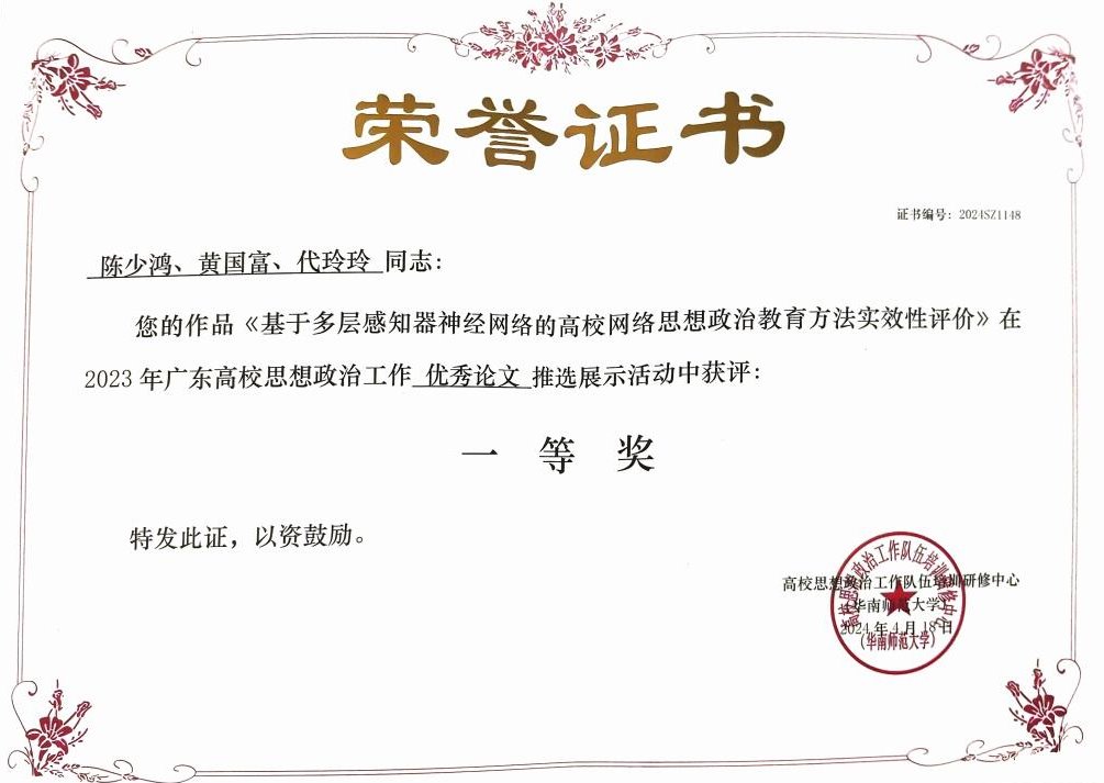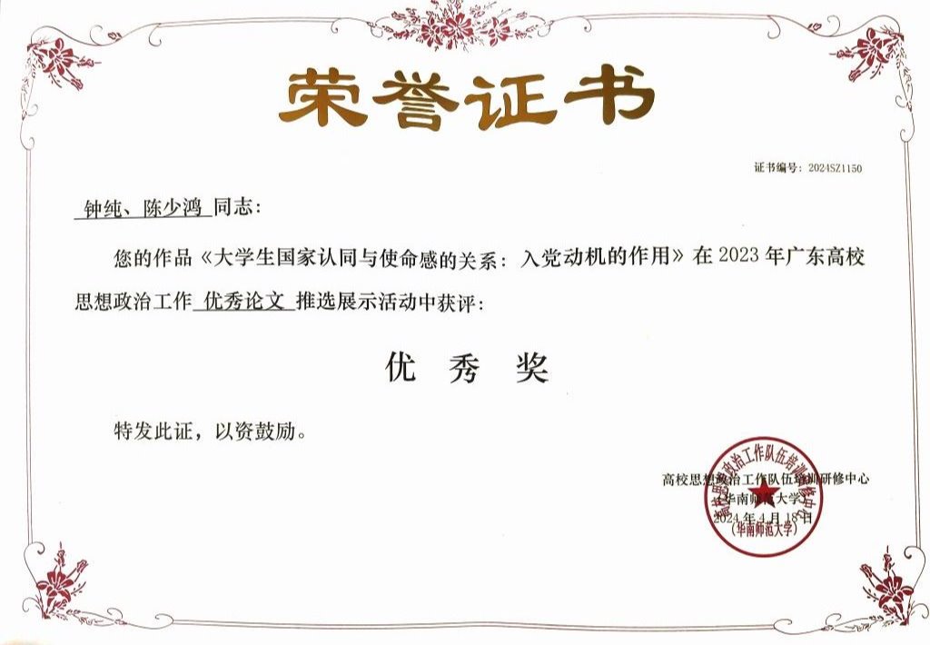 近日,2023年广东高校思想政治工作优秀论文、优秀案例、教学视频以及原创文化精品推选展示活动结果公布。我校推优报送的多项学工队伍优秀作品在本次比赛中获奖。其中,工作案例获奖10篇、工作论文获奖11篇、原创文化精品获奖1首、教学视频获奖2部。
