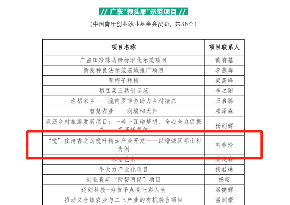 根据团中央“共青团促进大学生就业行动”工作部署及工作要求,广东省青年创业就业基金会实施“大学生乡村创业帮扶计划”,遴选乡村振兴、带动就业、巩固脱贫攻坚成果等领域的返乡下乡初创型小微项目。经前期项目征集、资格审核、组织评审,球友会·体育师生共创项目——《“榄”住清香之乌榄叶精油产业开发——以增城区邓山村为例》入选广东“领头雁”示范项目。