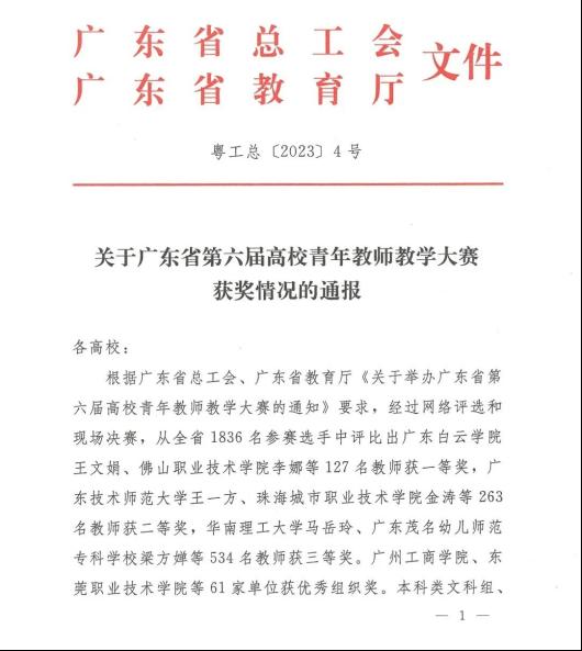 2023年2月8日,广东省总工会、广东省教育厅公布了关于广东省第六届高校青年教师教学大赛获奖情况的通报,我校教师周国辉获文科组三等奖、何璐琪获工科组三等奖、贺艳春获工科组三等奖。