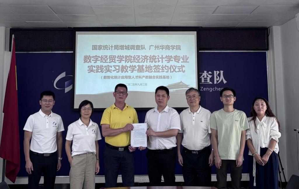 为加强我校经济统计学专业应用型人才培养,推动应用统计重点学科和硕士建设点建设,更好地让广大师生积极参与和服务地方发展,2025年9月2日上午,数字经贸学院经济统计学专业与国家统计局增城调查队在国家统计局增城调查队会议室顺利举行实践实习基地签约和揭牌仪式。