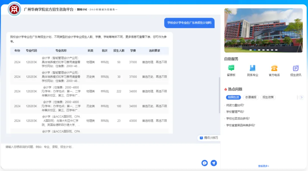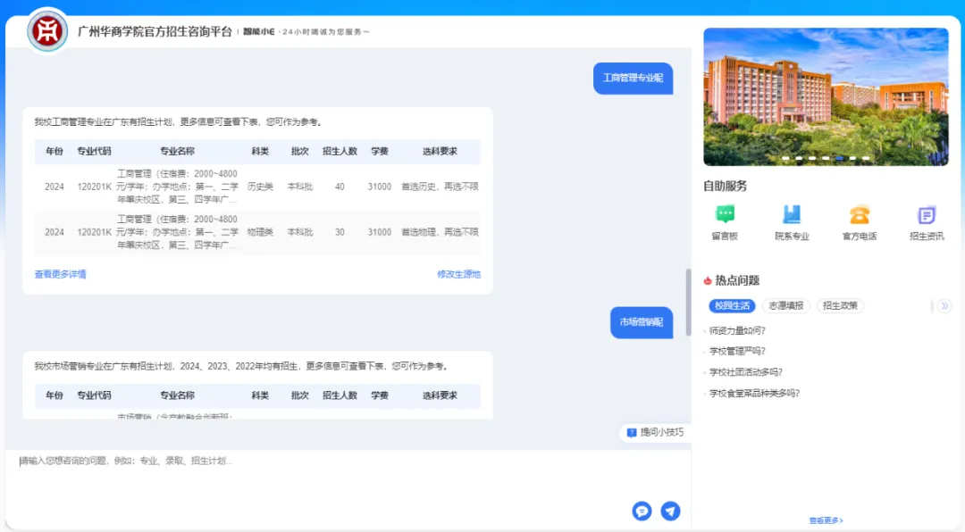 问答示例:当你问“我是广东考生,今年考了460分,想报你们学校能被录取吗”时,系统不仅能通过DeepSeek大模型技术精准识别你的咨询意图是:省份、分数、录取分数,还会结合历年录取数据,为你提供更有参考性的回复!