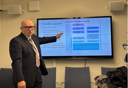 12月4日,访学团参访了芬兰哈格-赫利尔应用科学大学,副校长Jouni Ahonen、跨国教育项目经理Pasi Halmari、服务设计专家Sanni Aromaa、项目专员徐振宁Jenni和张星潜Cinzia一同迎接了访学团的到来。Pasi Halmari向访学团详细介绍了芬兰教育体系及教育制度,让访学团对芬兰教育的特色和优势有了更多的了解。
