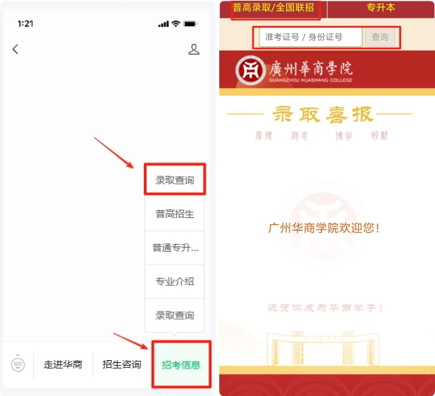 考生可通过学校官方微信公众号查询,具体路径为点击【校园生活】-【录取查询】-【普高录取/全国联招】,输入个人信息即可查询;也可通过招生办官方微信公众号查询,点击【招考信息】-【录取查询】-【普高录取/全国联招】,输入个人信息完成查询;还可登录学校招生信息网(http://zs.gdhsc.edu.cn/),进入球友会(中国)后点击【录取/成绩信息查询】,输入个人信息完成查询。