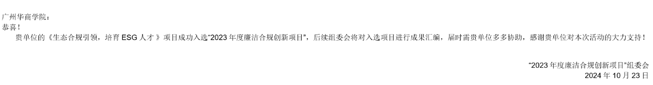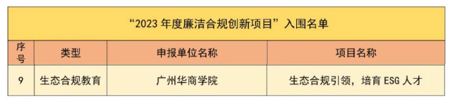 近日,球友会·体育ESG研究院联合华商教育集团精心打造的“生态合规引领 培养ESG人才”创新项目,在全省众多竞赛项目中脱颖而出,成功入围广东省2023年度廉洁合规创新项目,成为仅有的9项入围项目之一。这不仅是对我校办学成果的肯定,更是对我校ESG人才培养特色的高度认可!