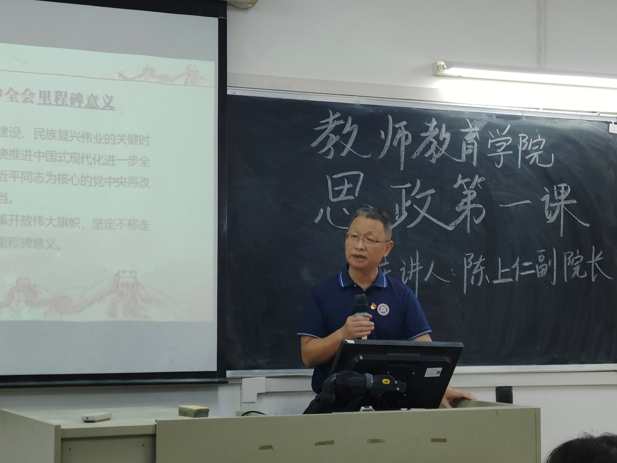 为全面贯彻党的教育方针,深入学习党的二十届三中全会精神,把握时代发展大势,教师教育学院于2024年11月6日下午在广州校区厚德楼C509和肇庆校区8号楼108开展2024年秋季学期“思政第一课”。本次课程旨在引导青年担当时代使命,以青春之力投身新时代,为中国式现代化贡献智慧与力量。本次“思政第一课”由教师教育学院陈上仁副院长、教师教育学院学生工作办公室江庆基副主任主讲。