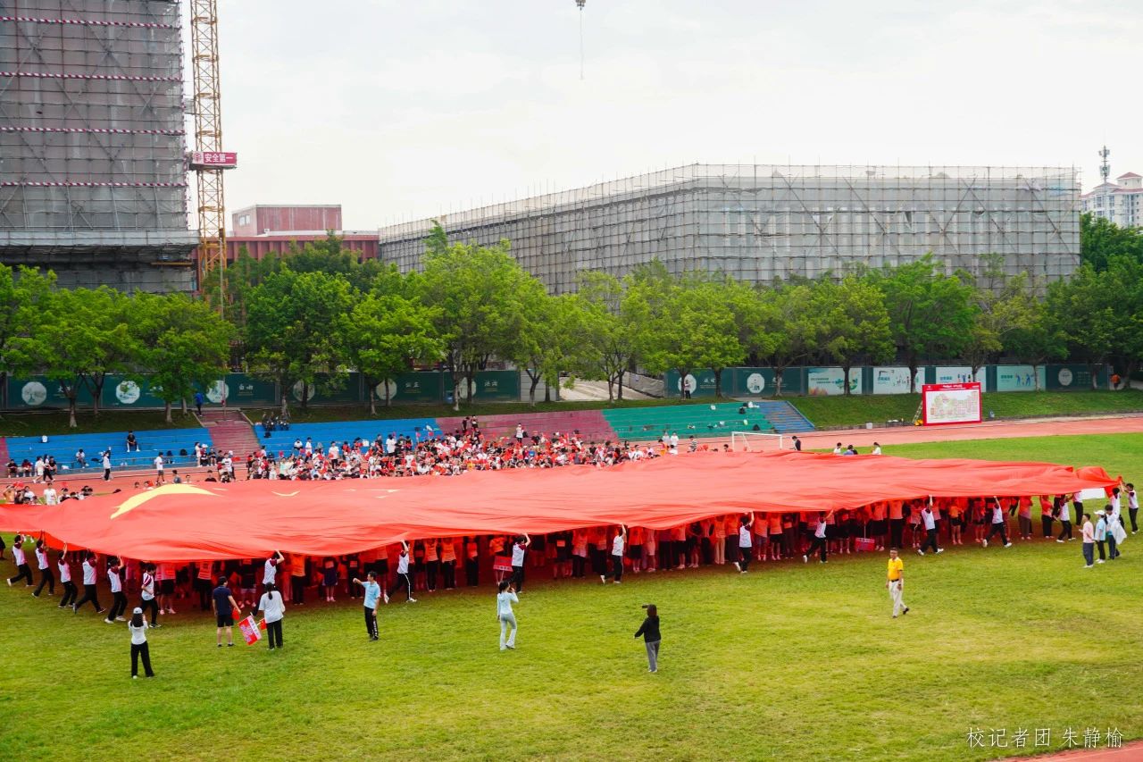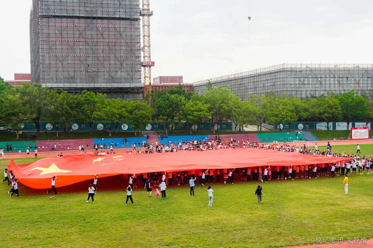 “五星红旗迎风飘扬,胜利歌声多么嘹亮”国旗方队飒爽英姿,75位志愿者稳稳高举巨幅国旗,600平方米的巨幅国旗从2500余名师生头顶掠过,象征着华商人“强国一代有我在”的赤子情怀,在进一步全面深化改革、推进中国式现代化的征程中彰显青春风采,贡献华商力量。此时此刻,生在国旗下、长在新中国被具象化。阳光透过国旗,撒下一地赤诚,抬头便是中国红。