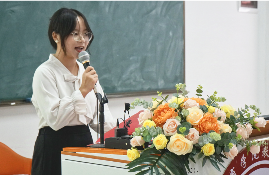 老生代表吴汝丽同学如一位引路人,分享了自己在教师教育学院的学习心得和动人的成长故事。她的话语如同温暖的阳光,洒落在每一位学弟学妹的心田,激励着他们珍惜时光,努力学习,为祖国的教育事业贡献自己的力量。