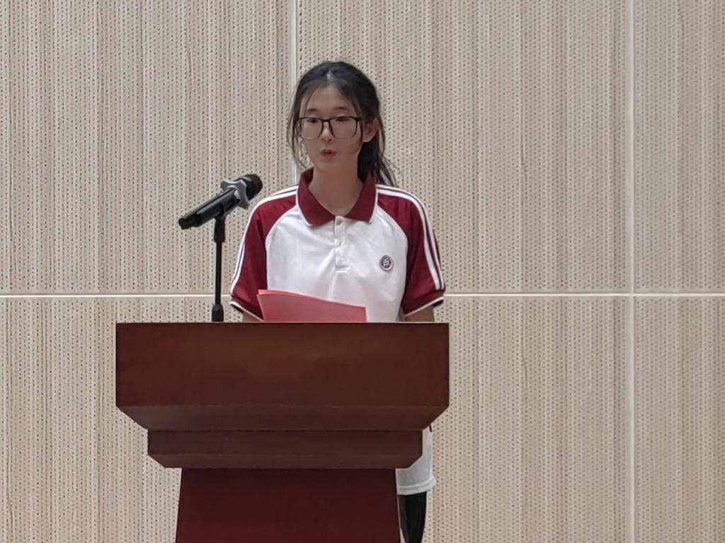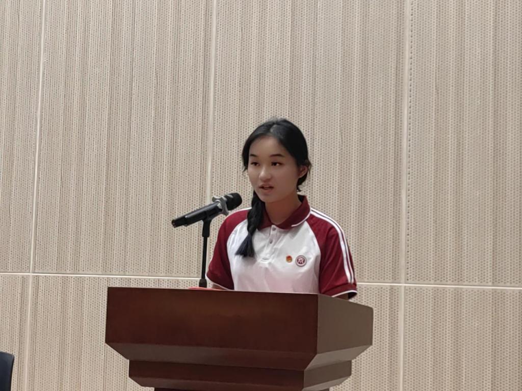 2023级老生代表徐文静发言。她分享了自己在会计学院的学习经历和感悟:第一,时间管理是大学生活的关键。第二,构建自己的人际网络。第三,保持好奇心与激情,勇于追求卓越。