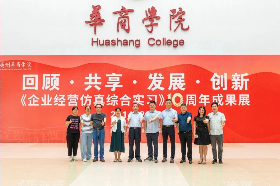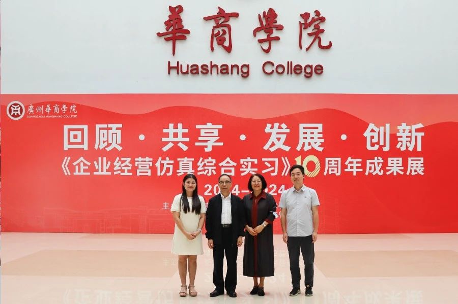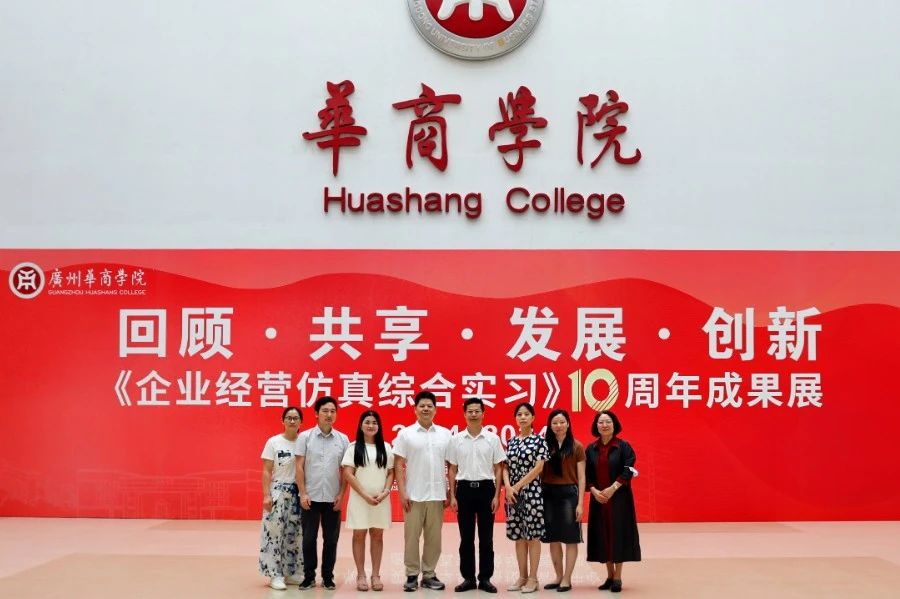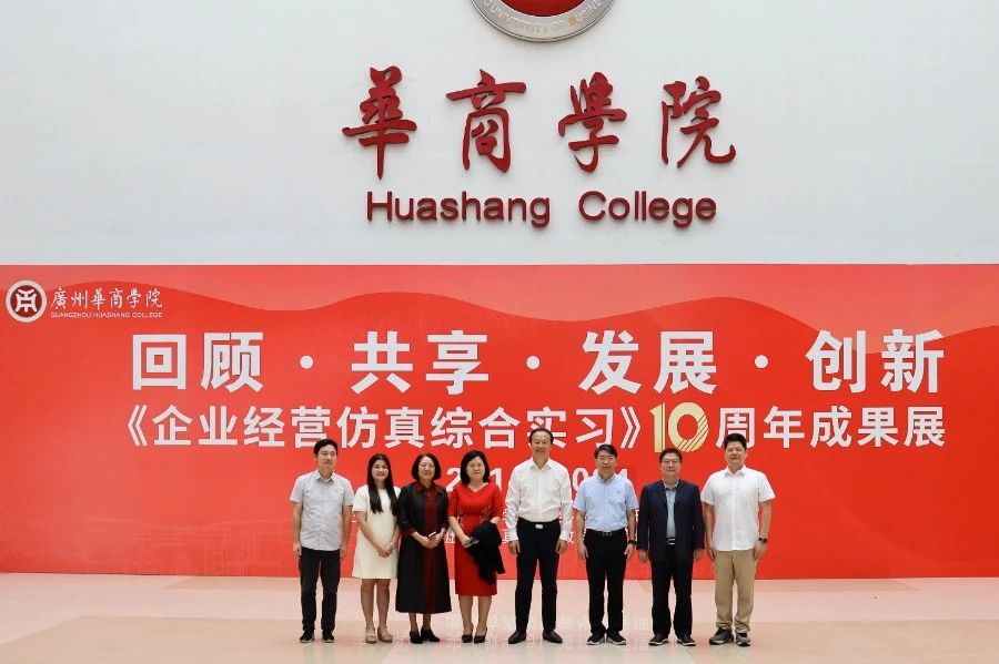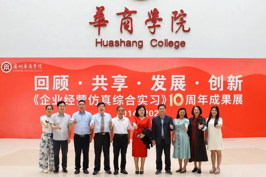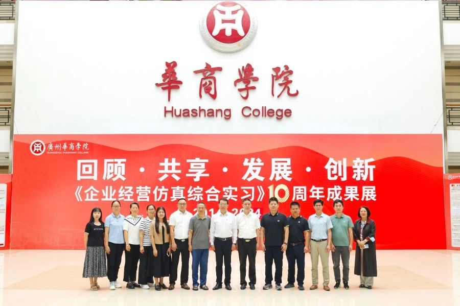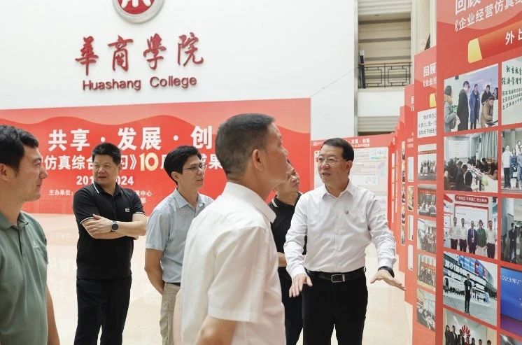 华商教育集团董事长廖榕就,学校总督学,党委书记陈玉欢,副校长刘少波、吕峻闽,学校顾问郭银华,广东财经大学国家级实验教学中心主任姚维保,副主任李立君,教学部部长陈韦伶,广东白云学院经管中心主任贺雪荣,球友会·体育会计学院、管理学院、人工智能学院等院系领导及师生,共同参观了《企业经营仿真综合实习》课程10周年成果展,见证了课程发展建设的阶段性“成绩单”。
