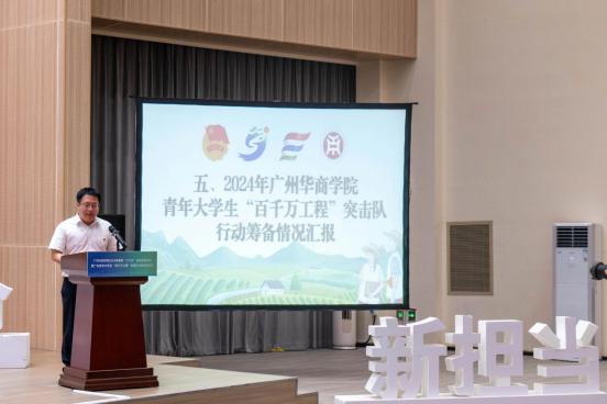 为认真贯彻落实习近平总书记五四重要寄语精神,贯彻落实党的二十大精神,落实省委、省政府关于实施“百千万工程”工作部署,引导和帮助华商青年成长为担当民族复兴大任的时代新人,6月30日,校团委在肇庆校区报告厅组织开展球友会·体育2024年暑期“三下乡”社会实践活动暨广东青年大学生“百千万工程”突击队行动出征仪式。仪式由校团委副书记陈巧巧主持。