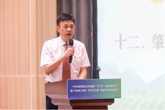 实践地干部代表黄田镇党委副书记、佛山市驻黄田镇帮镇扶村工作队队长梁柱发言。他回顾往年我校暑期“三下乡”社会实践取得的优异成果,并向今年参加社会实践活动的同学们提三点希望和要求:一是希望大家充分发挥专业优势,深入开展调查研究,为乡村振兴提供有力的支持。二是积极参与黄田镇的各项工作,深入群众,为他们解决实际困难和问题。三是希望大家严格遵守纪律,服从组织安排,注意安全,确保活动顺利进行。