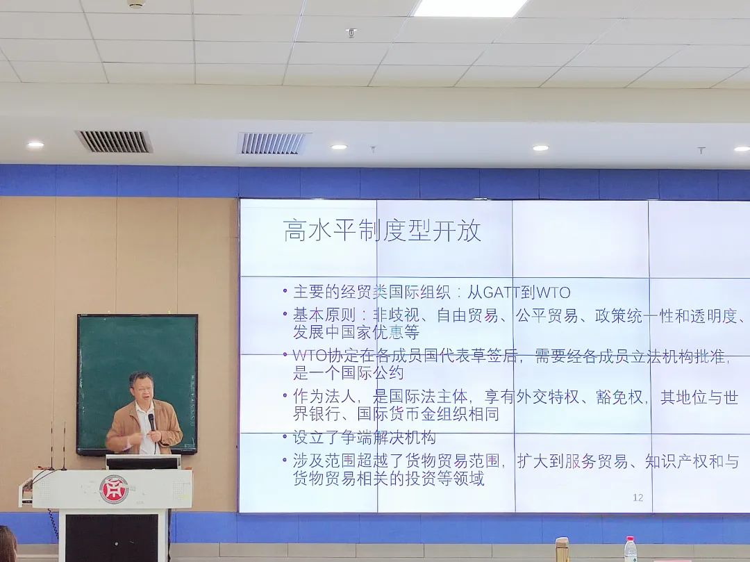 李广明教授为同学们介绍了中国服务贸易发展现状,对于中国服务贸易结构特点进行剖析,并就如何应对中国贸易的突出问题提出了自己的见解。同时,他还详细介绍了区域经济集团的基本概念和常见形式,让同学们更加全面地了解到认识当今世界经济区域集团化发展趋势。