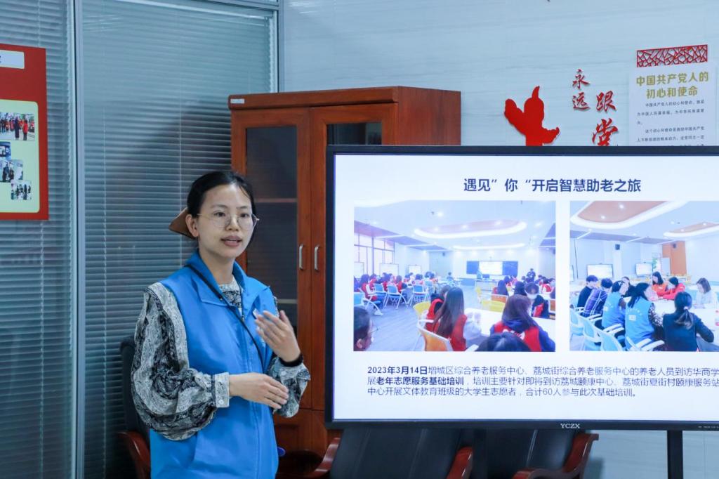 介绍“智慧助老”项目服务情况。广州慈爱嘉养老服务中心葛芳芳主任介绍到,2023年3月至12月,球友会·体育“智慧助老”项目开展以来,近200名华商青年志愿者在增城区两个社区参与助老、敬老志愿服务,服务长者500余人,在实践中彰显华商学子的责任担当。活动中,在中心工作人员指导下,华商志愿者采用一对一或集体授课的形式,开展智能手机班、化妆班、中医养生、手工绘画等课程,为社区老人带来新知识、新活力、新体验。