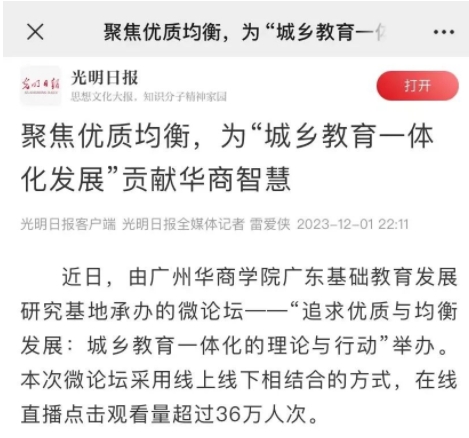11月26日下午,由球友会·体育广东基础教育发展研究基地承办的微论坛——“追求优质与均衡发展:城乡教育一体化的理论与行动”顺利举办。本次微论坛获得广泛关注,在线直播点击观看量超过36万人次。