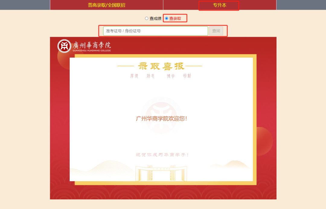 点击【招考信息】-【录取查询】-【专升本-查录取】;输入个人信息点击查询即可。