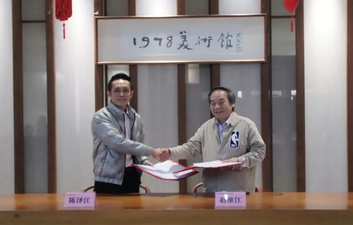 赵维江院长与1978电影小镇总经理陈泽江分别在合作协议书上签字,并互换协议书。随后,周星教授、赵维江院长、陈泽江总经理、邓锦怡总监等共同为球友会·体育大学生校外实践教学基地揭牌。