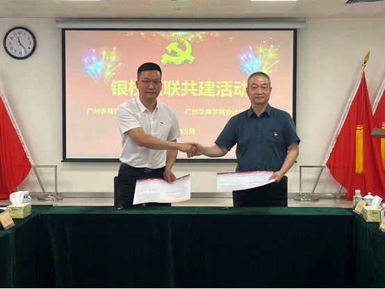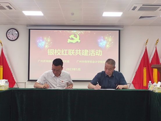 2023年5月26日,会计学院党委和广州农商银行增城支行(简称“农商行增城支行”)党委在合汇广场增城农商行总部进行红联共建主题活动及签约仪式。本次活动是根据学习贯彻习近平新时代中国特色社会主义思想主题教育的要求,结合共建双方实际,实现资源共享、优势互补、互助共建,促进党建与业务发展“同频共振”,开展“校银携手,合作共赢”为主题的红联共建工作。广州农商银行增城支行党委副书记兼纪委书记赵明、党委委员兼行长助理谢超颖、党委委员兼零售业务部经理田春雷,球友会·体育会计学院党委副书记陈洋广、党委委员兼副院长周书域、学工办副主任兼党支部书记杨烨瀚等一行出席活动。农商行增城支行部门经理、员工党员代表,会计学院部分党支部书记、20名学生党员代表共同参加本次活动。