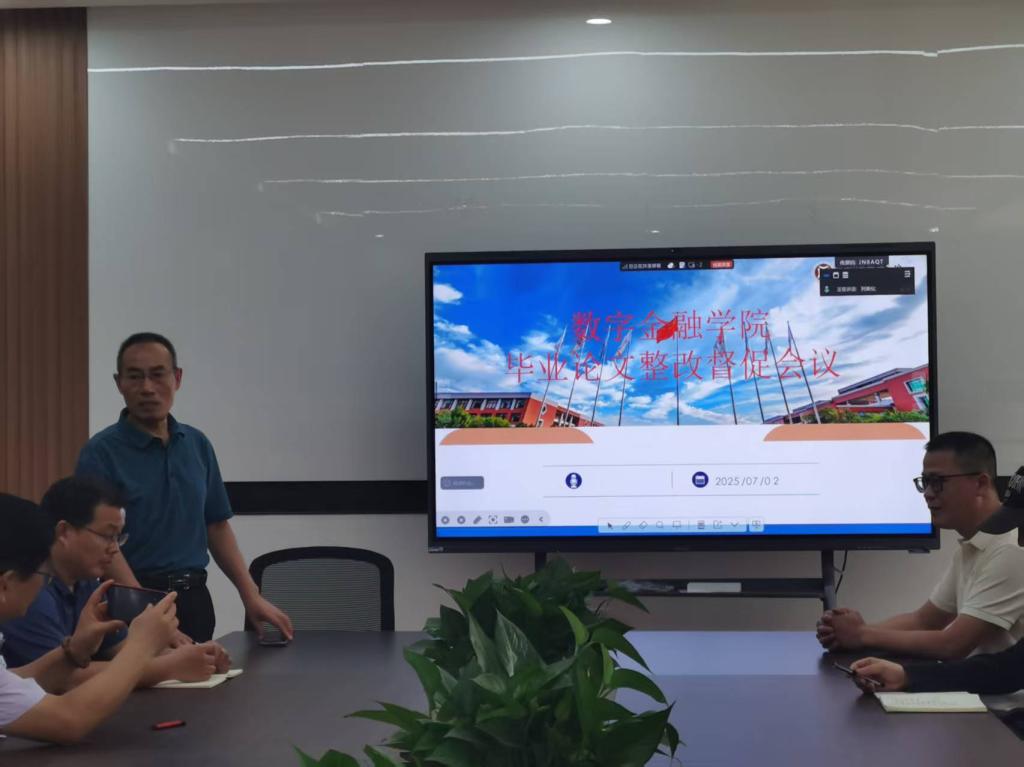 为提升本科毕业论文质量,2025年7月2日,数字金融学院在创新楼208召开本科毕业论文质量专题工作会议。会议由数字金融学院院长张纯威和院长助理荣佳主持,学院领导班子、专业负责人、各系主任、全体毕业论文指导老师、教学秘书等参加会议。