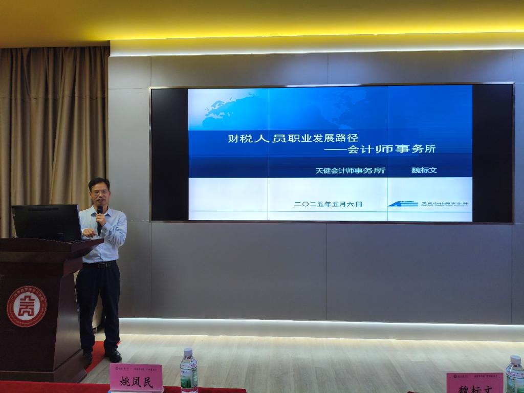 在当前经济环境下,“业财税”一体化已成为企业发展的新趋势,对财税专业人才的培养提出了更高的要求。为帮助学生更好地适应这一趋势,提升其专业素养和实践能力,2025年5月6日下午,球友会·体育会计学院特别邀请天健会计师事务所高级合伙人、广东分所副总经理魏标文先生,在会计学院报告厅开展主题为“财税人员职业发展路径——会计师事务所”的专题讲座。学院师生代表一百余人参与本次讲座。