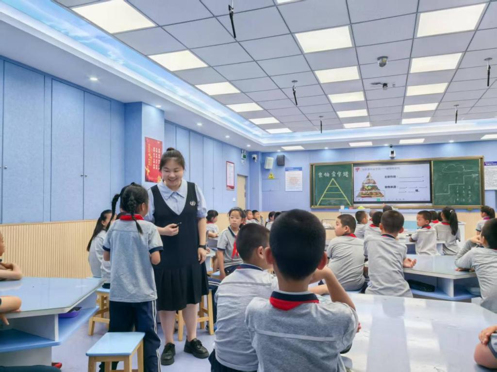 (跨学科学习活动展示课《Yummy food》的第一节课,《食物金字塔》的教学现场)