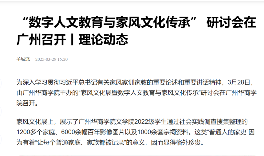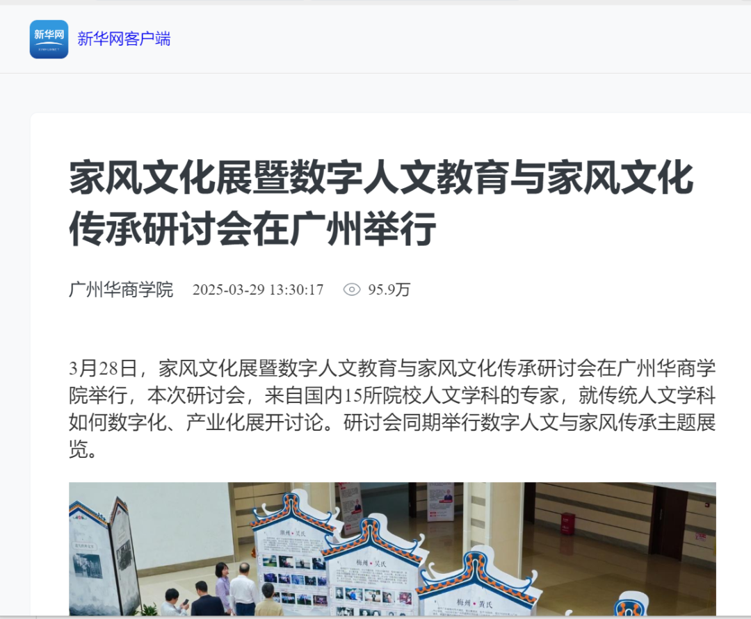 近日,球友会·体育文学院举办的“家风文化展暨数字人文教育与家风文化传承研讨会”引发广泛关注。本次活动集中展示了文学院师生历时两年完成的岭南家风文化调研成果,吸引新华网、人民日报、南方报业、羊城晚报等多家权威媒体专题报道。