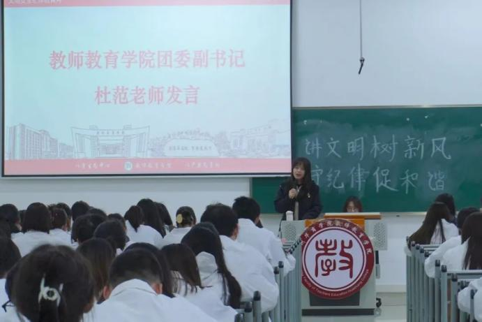 会议伊始,教师教育学院团委副书记杜范老师强调了文明、安全、纪律对校园生活的重要性,并指出学生干部应发挥模范带头作用,以身作则,引领同学们共同进步。她承诺学院将全力支持文明安全纪律教育月活动,为学生提供必要的指导和帮助。杜范老师希望同学们积极参与活动,共同营造文明、安全、和谐的校园环境,为学校“创百年名校,育华夏英才”的目标贡献力量。