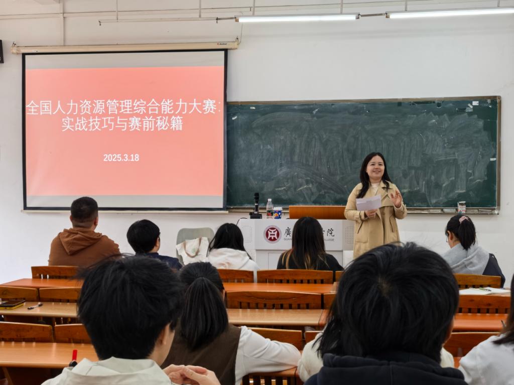 2025年3月18日下午,管理学院在励志楼C302成功举办了一场题为“全国人力资源管理综合能力大赛:实战技巧与赛前秘籍”的讲座。本次讲座旨在为即将参加第十届全国人力资源管理综合大赛的同学们提供专业的赛前指导和实战技巧,帮助他们更好地备战大赛。