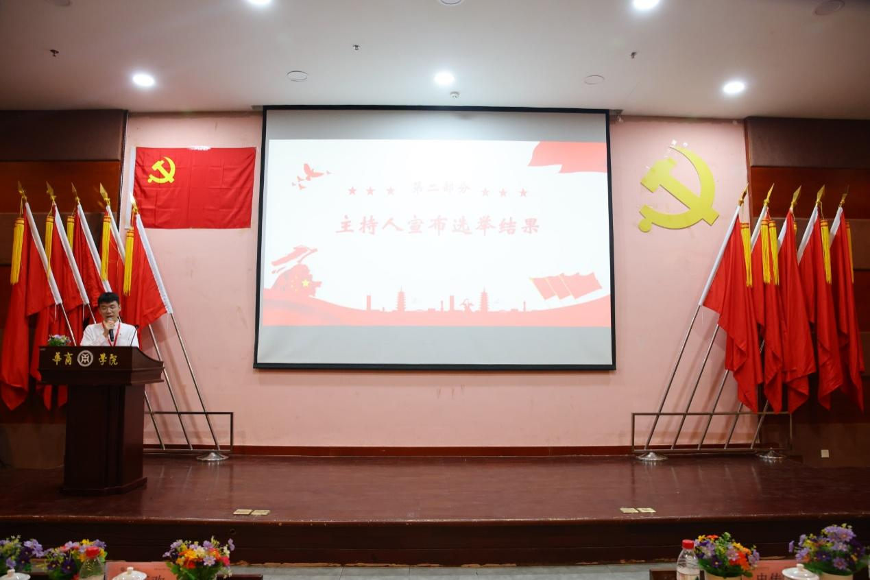 主持人何威义同志宣布中共球友会·体育管理学院新一届委员会第一次全体会议选举结果和委员分工情况。